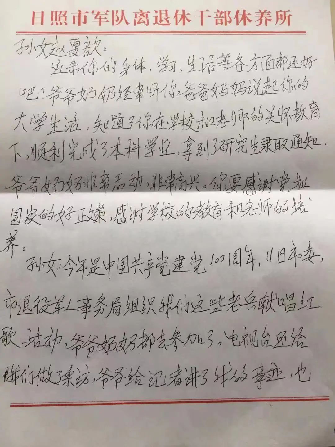 2021年本科毕业前夕,赵雯歆收到了一封“红色家书”。家书中,爷爷以一名退伍老兵和老党员的身份,鼓励她坚持自我,做一个自信坚强、对国家有用的人。此后,每当遇到挫折时,她都会想起爷爷对她的支持,更有动力继续前行。