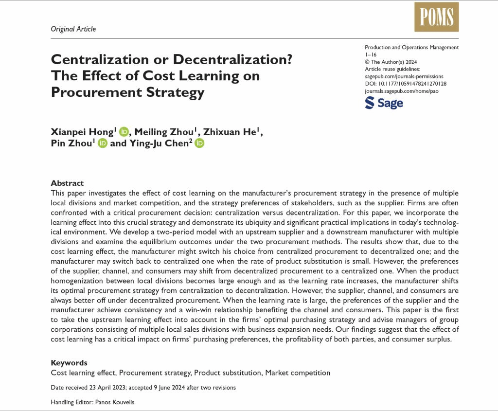 近日,公司洪宪培教授、周品副教授、博士生周美伶、硕士生何芷璇与香港科技大学陈滢儒教授合作撰写的论文“Centralization or Decentralization? The Effect of Cost Learning on Procurement Strategy”发表于国际顶级管理学期刊UTD 24期刊Production and Operations Management。该研究得到了国家自然科学基金、香港研究资助局的资助。